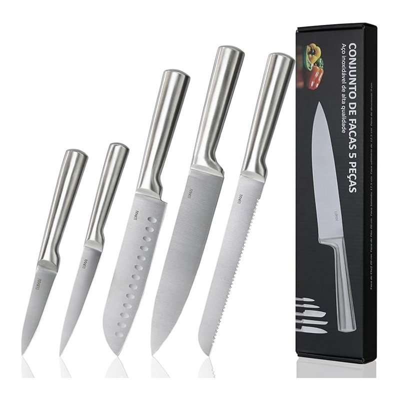 Conjunto de 5 Facas Lumai Grandes de Cozinha Zurich Robusto em Aço Inoxidável 3CR13 com Lâminas Inteiriças – Forja Prolongada para Robustez, Anti ferrugem, Ultra Afiadas e Precisão Suíça