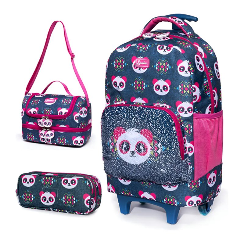 Kit Mochila Rodinha Escolar Spector Panda Azul com Estojo e Lancheira
